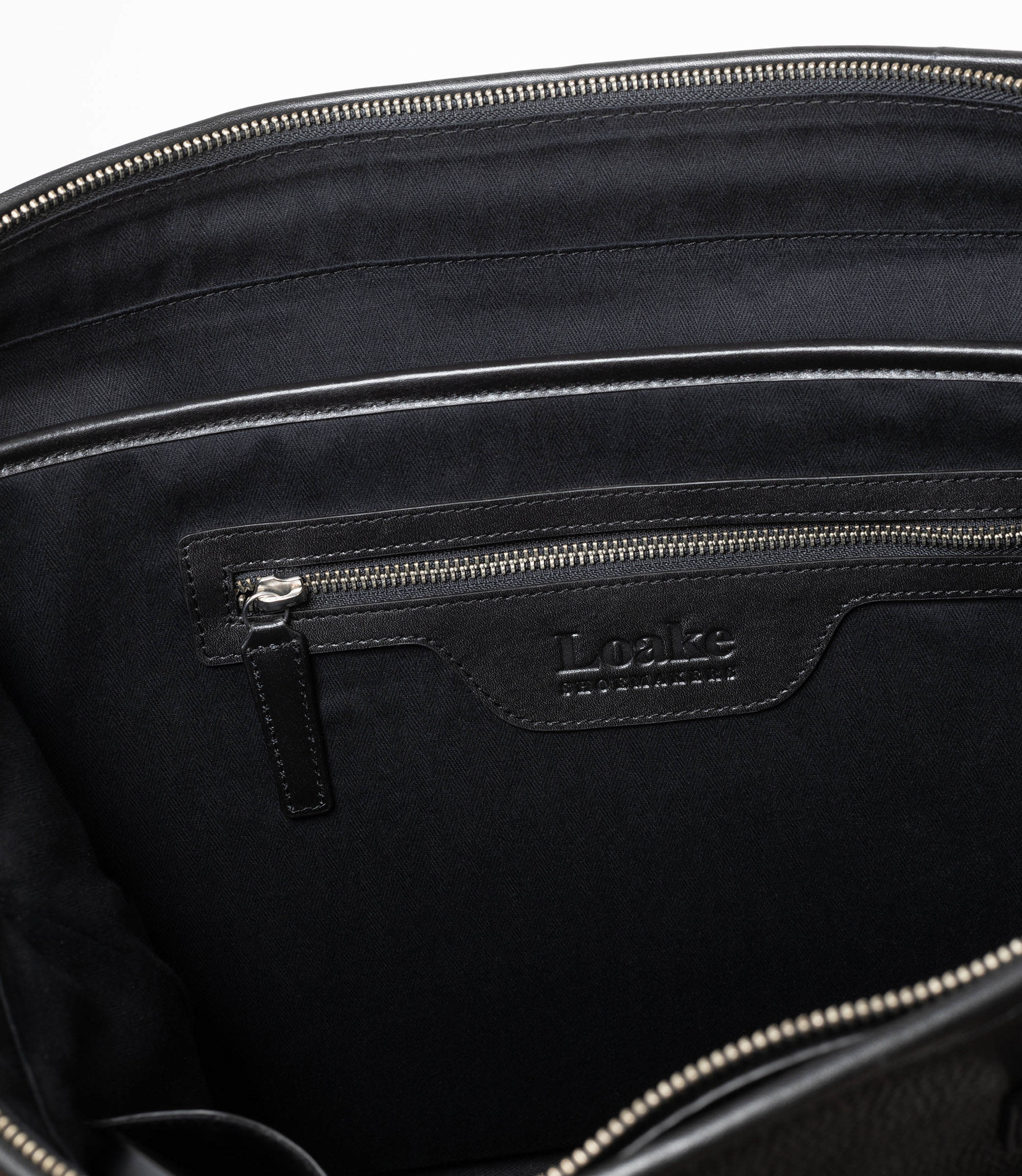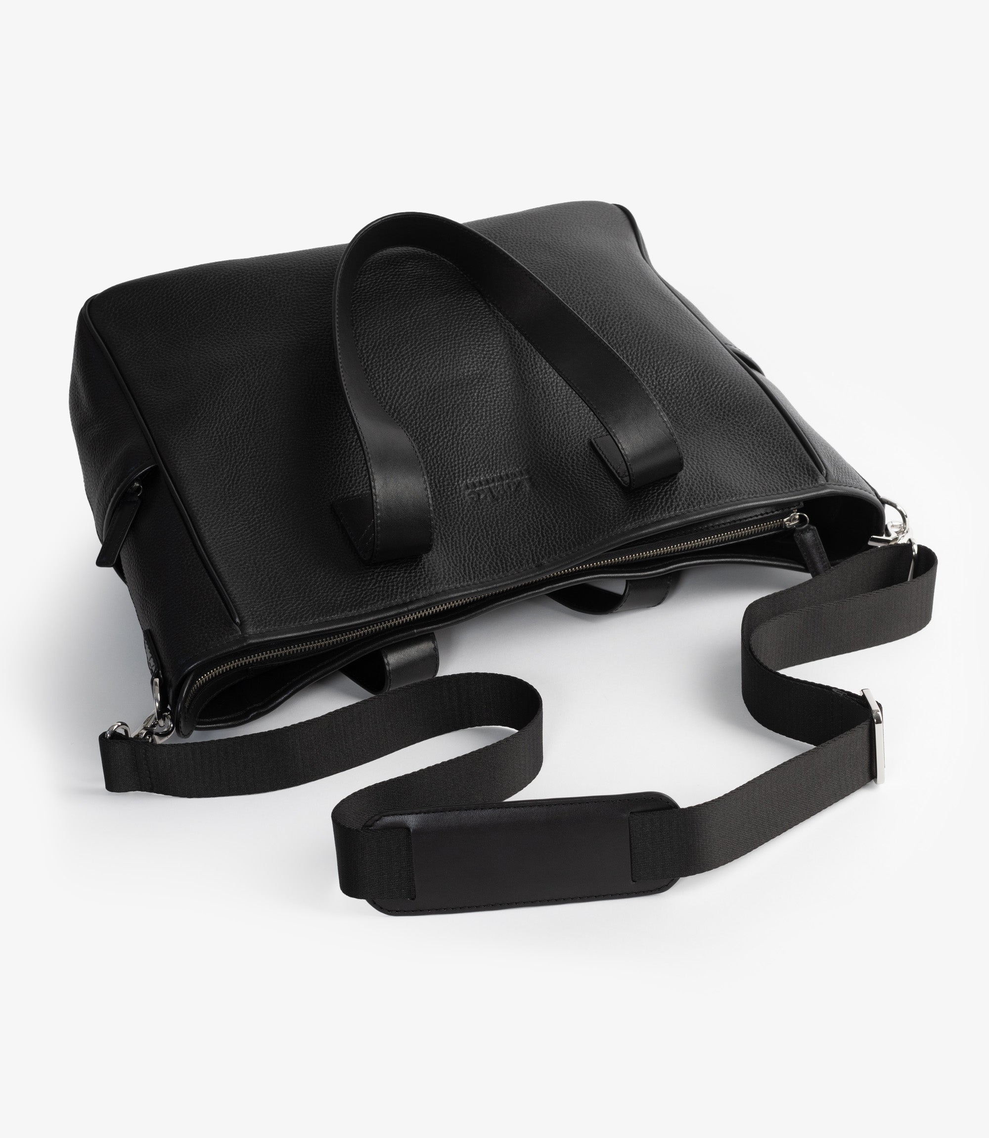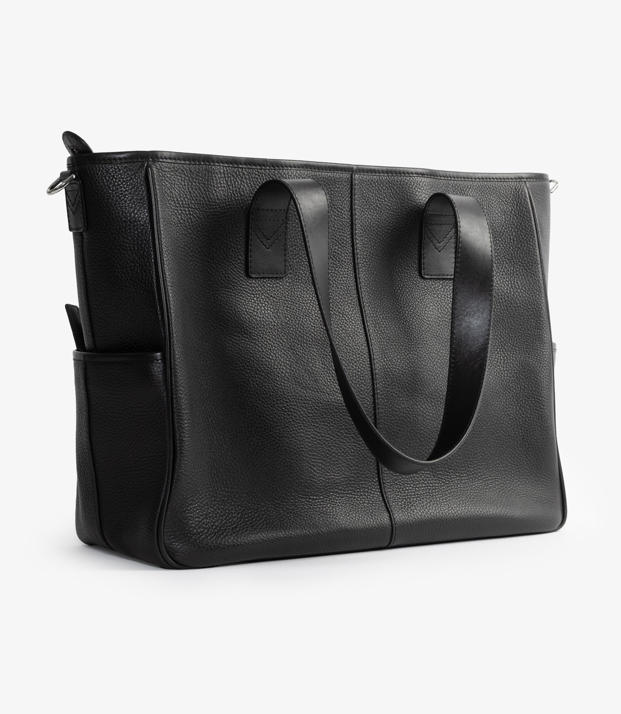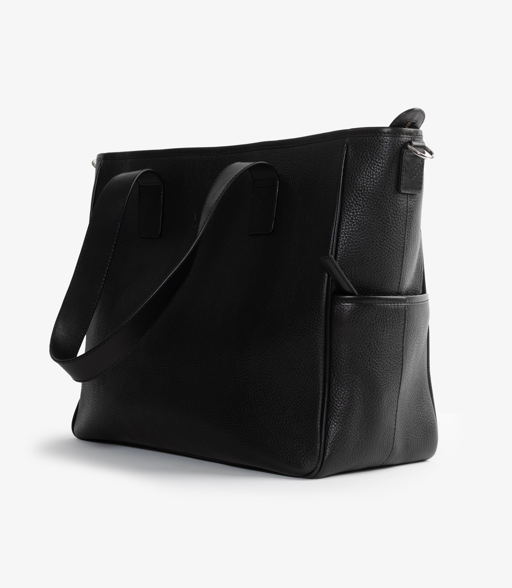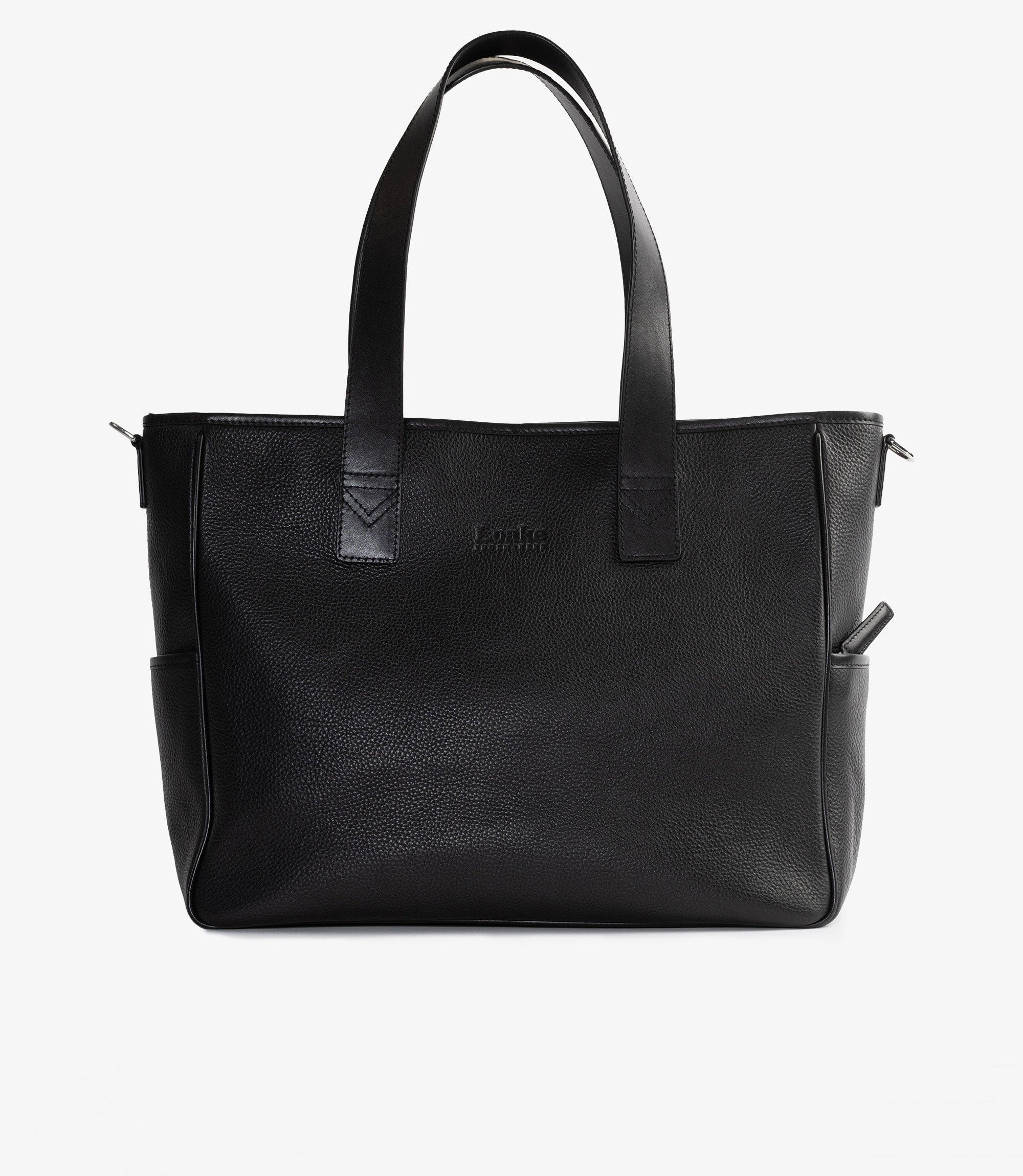 Premium tote bag in black grain leather. Our tote bag is the perfect everyday bag. Suitable for your laptop, lunch box and gadgets. Two external pockets. One with zipper and one open for easy access to a compact umbrella. The inside is divided with a separate laptop compartment. One internal zip pocket along with other smart storing for pencils, cards and daily utilities. Long leather straps to comfortly hang it on your shoulder. Featuring a detachable shoulder strap. This tote bag is designed and engineered in Kettering, made in our high-grade factory in India.